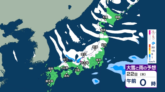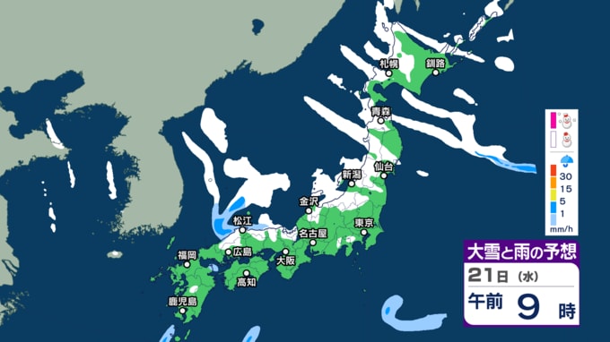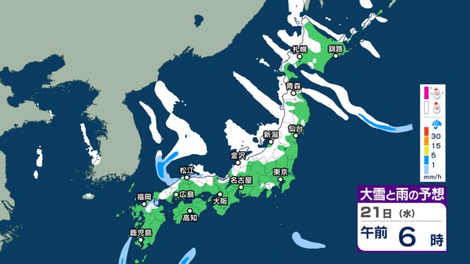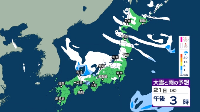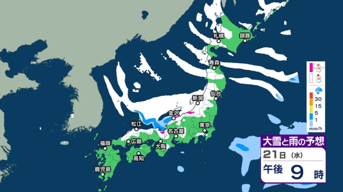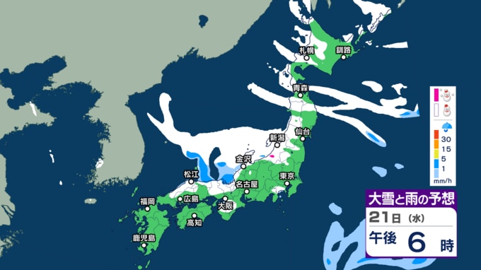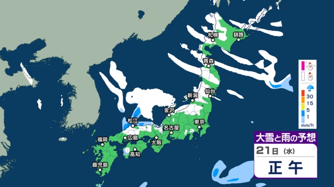 【大雪】“最強クラス”寒波の影響、21日~25日ごろ北~西日本の日本海側を中心に平地でも大雪のおそれ(雨・雪シミュレーション) 北陸100cm、東北70cm、近畿・北海道50cm、関東甲信40cm予想 テレビ高知 2026年1月20日(火) 14:44 国内 天気 21日(水)午前6時~22日(木)午前6時 21日朝6時~22日朝6時までに予想される24時間降雪量(多い所) 北海道地方 40センチ 東北地方 70センチ 関東甲信地方 40センチ 北陸地方 100センチ 近畿地方 50センチ