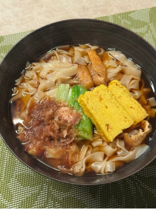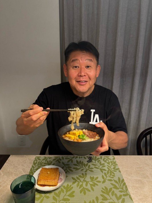 練習後の夕食には「きしめん」を選んだ花田さん。ブログ投稿には、黒い丼に盛られた幅広の平打ち麺と、油揚げ、黄色い卵焼き、緑の野菜、鰹節が入った料理の写真が添えられています。また、黒いTシャツを着た花田さん本人が、笑顔で食べている様子も投稿されています。