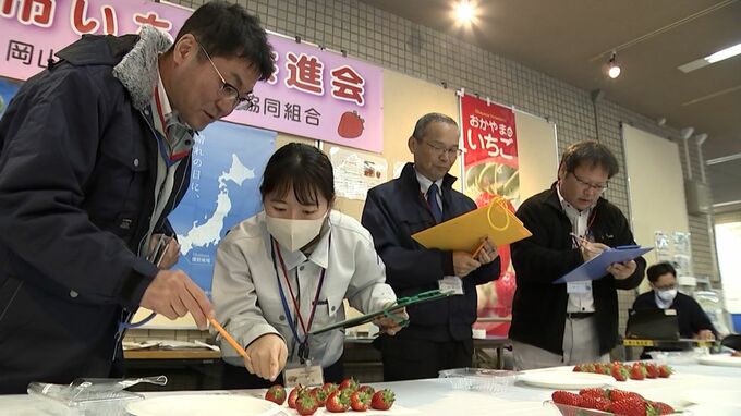JA岡山によりますと、今年のイチゴは冬の冷え込みの影響で甘みが強いといい、会場では8人の審査員が色や形、糖度などを評価していました。
