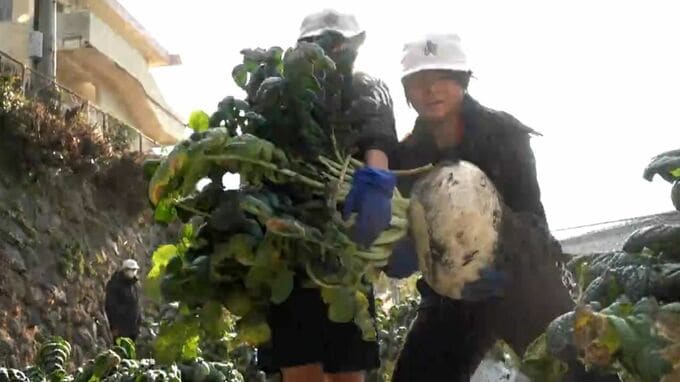 「せ~のっ」(大根を持ち上げて運ぶ)
