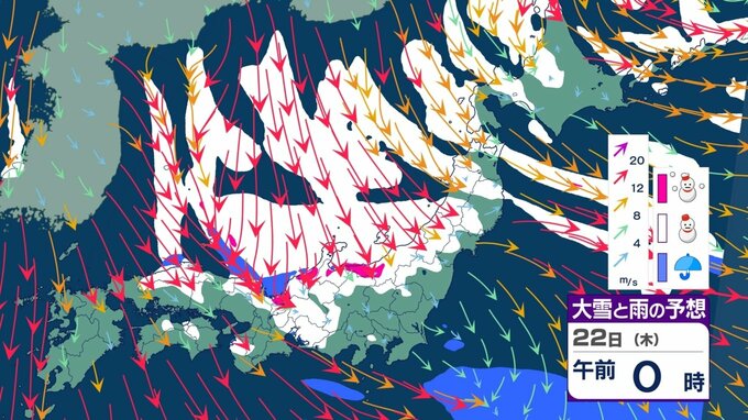 特に、強い寒気が流れ込む22日は、東北地方南部から山陰にかけての日本海側を中心に発達した雪雲が流れ込むため、降雪が強まって降雪量がかなり多くなるでしょう。