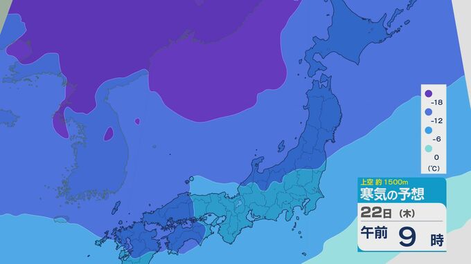 22日(木)午前9時の予想天気図ですが、日本海の縦の等圧線の間隔が小さくなっています。北から北西よりの日本海からの風が強まりそうです。