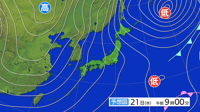 21日(水)午前9時の予想天気図です。20日から冬型の気圧配置になり、その状態が続きそうです。