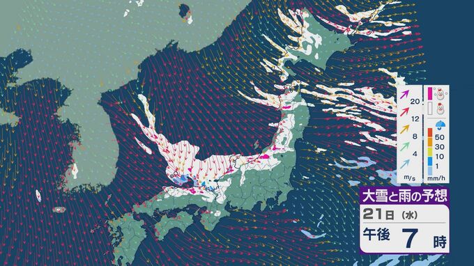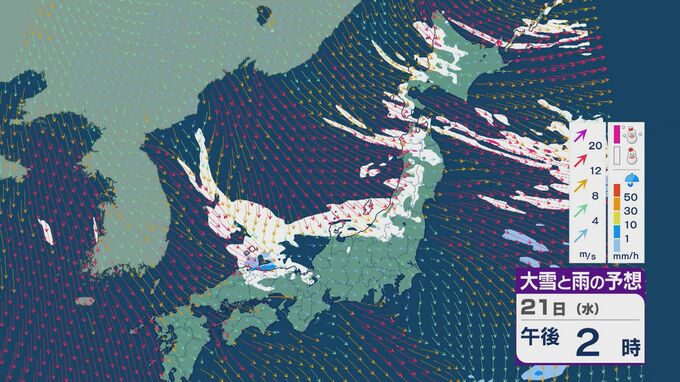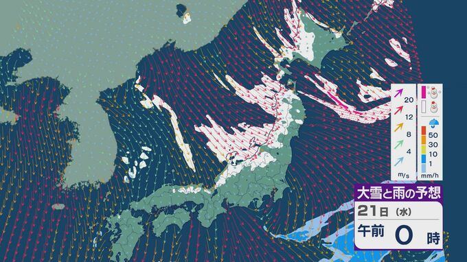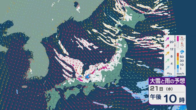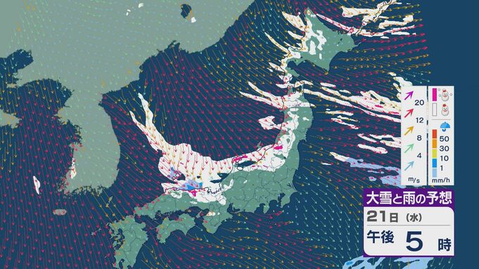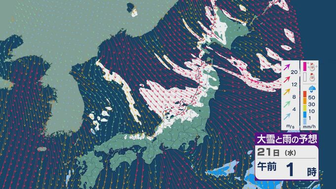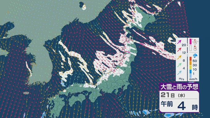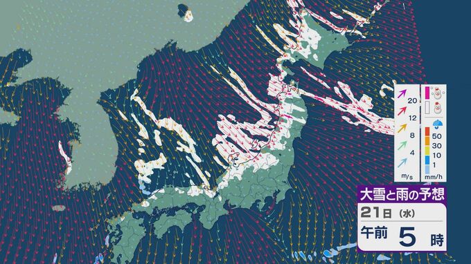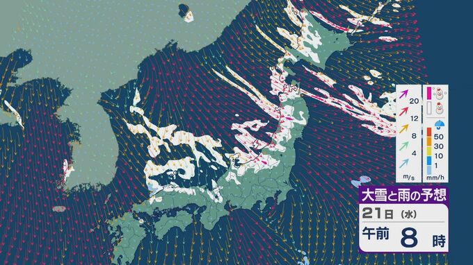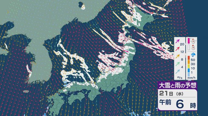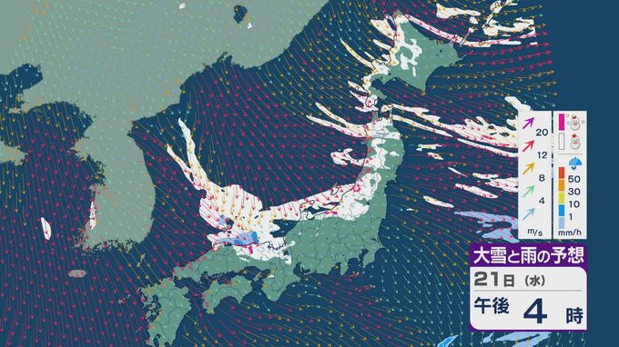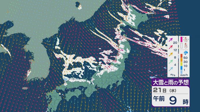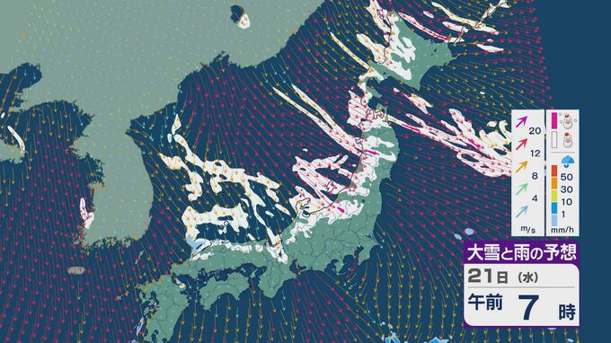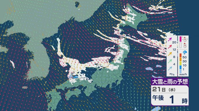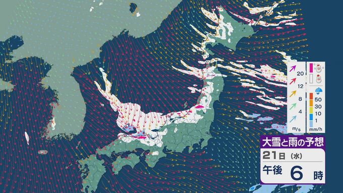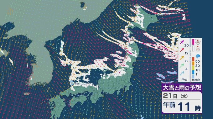 21日は、日本海側では一日を通して雪が降るでしょう。沿岸部を中心に風が強まるところもありそうです。昼過ぎからは、日本海で風が収束することで雪雲が発生するJPCZ(日本海寒帯気団収束帯)の影響を受けそうです。山陰や近畿北部、北陸の福井県あたりに発達した雪雲がかかりそうです。