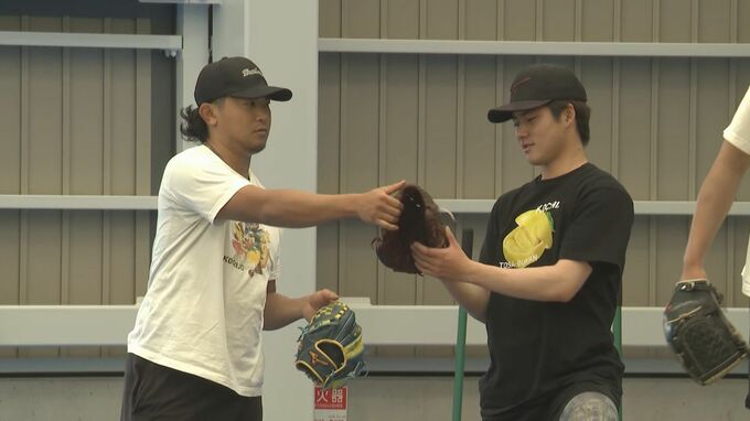 2人は仲良く高知県の名産品が書かれたTシャツを着て、キャッチボールや投球練習など、2時間半しっかりトレーニングに勤しみました。