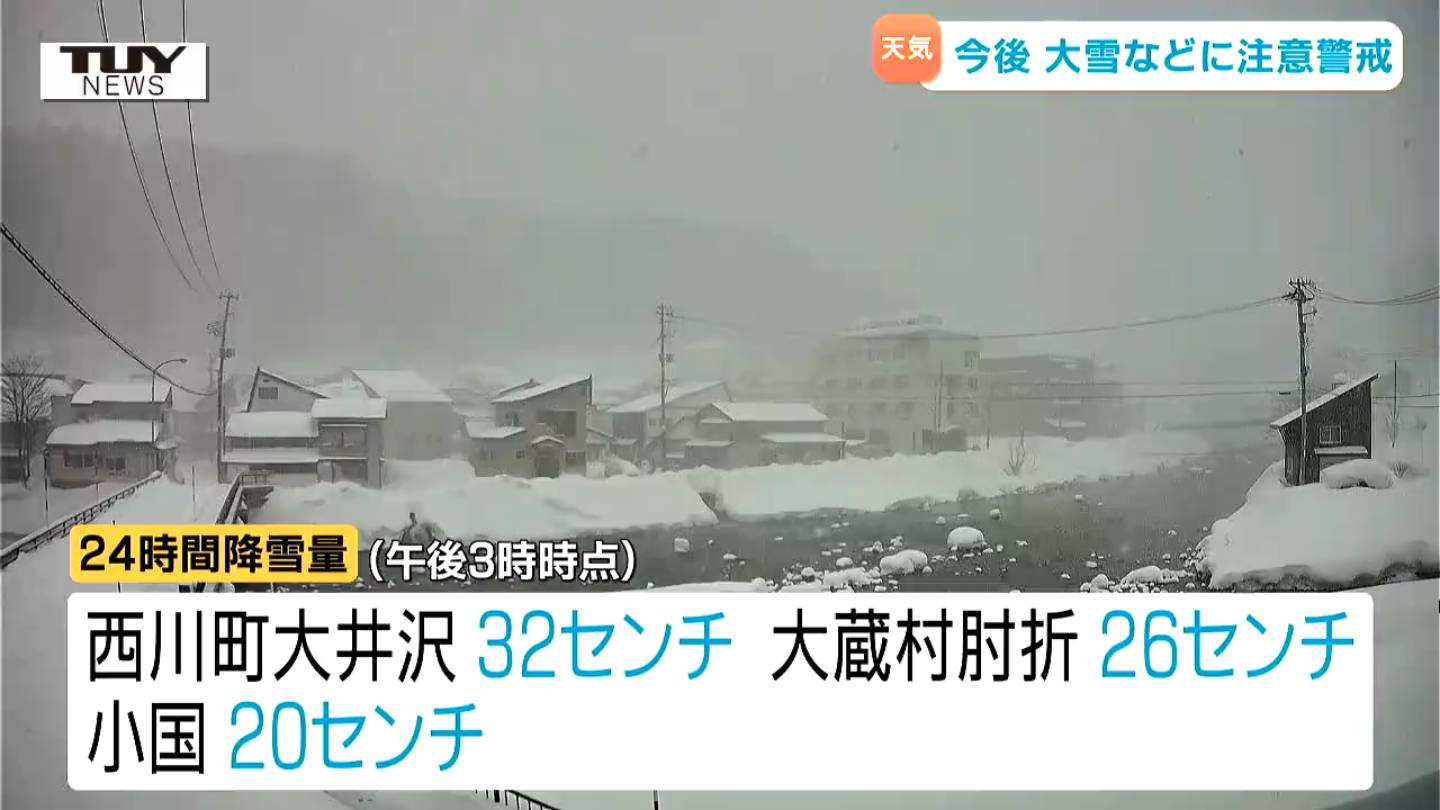 また、午後3時までの24時間降雪量は西川町大井沢で32センチ、大蔵村肘折で26センチ、小国で20センチとなっています。