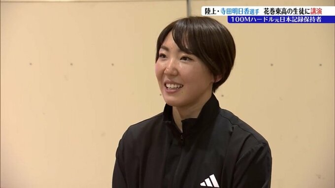 100メートルハードル元日本記録保持者の寺田明日香選手が20日、花巻東高校の生徒に自らの競技経験を踏まえて講演しました。(寺田明日香選手講演)「一つひとつクリアしていくことで意外と叶うにつながっていく」10…