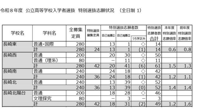 長崎西や長崎南で前年より倍率が上がっています。一方、長崎東では前年度に続き定員割れとなっています。