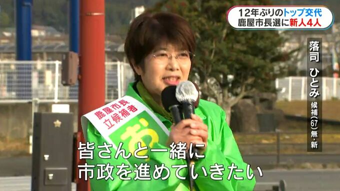 (落司ひとみ候補(67)無・新)「女性だからこそ変えられることも、たくさんあると思う。市民の皆さんの意見を聞きながら、皆さんと一緒に考えて、皆さんと一緒に市政を進めていきたい」