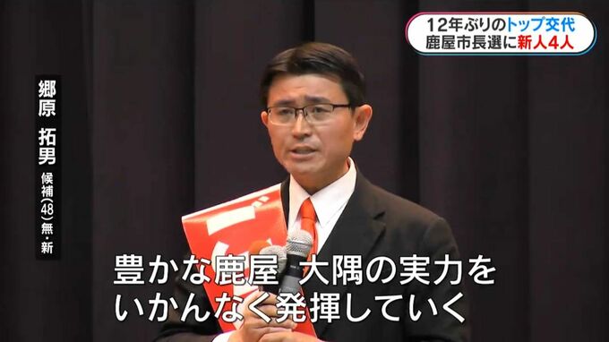 新人の郷原拓男さんは、鹿屋市郷之原町出身の48歳。県議を3期10年半務めました。国や県と連携した農業振興や企業誘致などを訴えています。