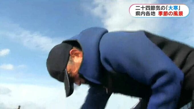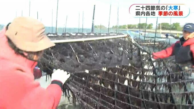 一方、こちらは出水市です。特産の養殖ノリの収穫が最盛期を迎えています。時おり白波が立つ冬の冷たい海に浸かり、生産者は30センチほどに育った初ノリを機械で摘み取っていました。