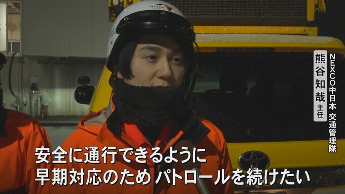 NEXCO中日本 交通管理隊 熊谷知哉 主任「路面が悪い状況が続きます。防災対策室と連携を取り合って積雪等が多ければ防災対策室に除雪対応の方を電話連絡したりと、お客様が安全に通行できるように早期の対応ができるようにパトロールを続けていきたい」