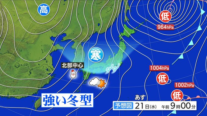 21日(水)南部は晴れ間 北部は積雪増加 きょうよりさらに寒く