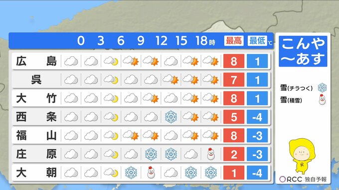 こんやからあす朝にかけて気温は急降下し、最低気温は、けさより5℃~10℃近く下がる見込みです。風邪を引かないよう、暖かくしてお過ごしください。最高気温はきょうより2℃~5℃ほど低くなり、真冬並の寒さになるでしょう。北部を中心に路面状況の悪化にご注意ください。