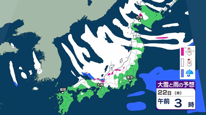 気象庁によりますと、21~22日は、850hPaでは、北日本には-15℃以下、東~西日本には-12℃以下の強い寒気が流れ込み、普段雪の少ない太平洋側でも大雪となるところがあるでしょう。