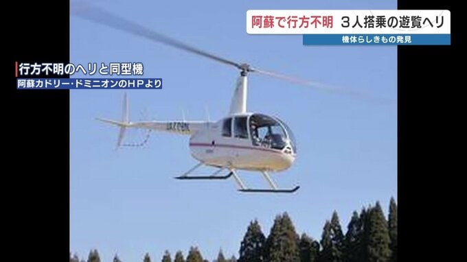 ヘリを運航する匠航空などによりますと、行方不明になったヘリは、男性パイロット(64)と、台湾出身の男性(41)と女性(36歳)の2人が客として搭乗し、午前10時52分に離陸して草千里や阿蘇中岳を回り、約10分後に戻る予定でした。