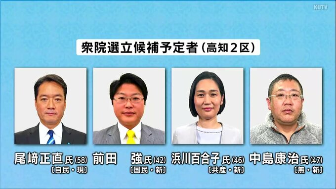 高知2区には自民党の尾﨑正直氏、国民民主党の前田強氏、日本共産党の浜川百合子氏、無所属の中島康治が出馬を予定しています。