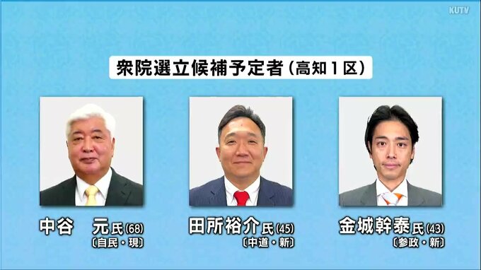衆院選高知1区には自民党の中谷元氏、中道改革連合の田所裕介氏、参政党の金城幹泰氏の3人が。