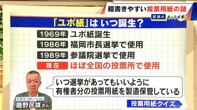 ユポ紙、実はかなり歴史があるんです。誕生したのは今から57年前の1969年のこと。 初めて選挙で使われたのは、1986年の福岡市長選挙でした。そして今では、ほぼ全国の投票所で、選挙を支える存在として使われるようになりました。