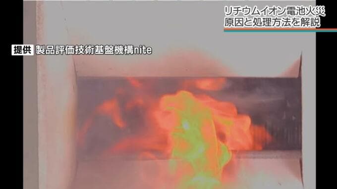 製品評価技術基盤機構(nite)の実験映像では、リチウムイオン電池が破砕機にかけられるとたちまち発煙、発火します。
