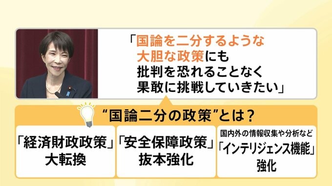 “国論二分の政策”には、▼「経済財政政策」の大転換、▼「安全保障政策」の抜本強化、▼国内外の情報収集や分析など「インテリジェンス機能」の強化などが挙げられます。