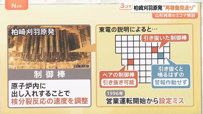 東電の説明によると、再稼働にむけた試験で、1本の制御棒を引き抜くと、ペアになっている制御棒は引き抜くことができるといいます。