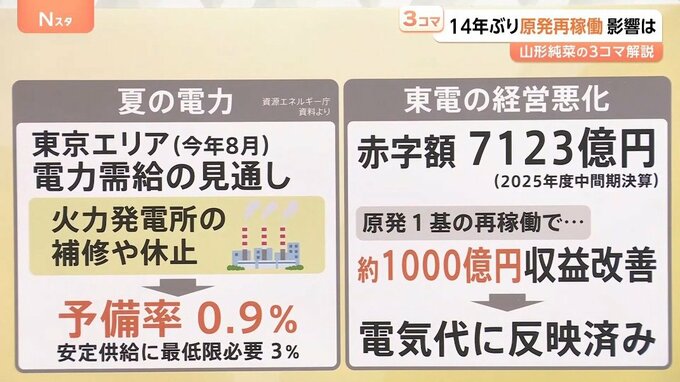 2025年度の中間期決算で7123億円という過去最大の赤字額を出しているなか、原発1基の再稼働で約1000億円の収益改善が見込まれるといいます。