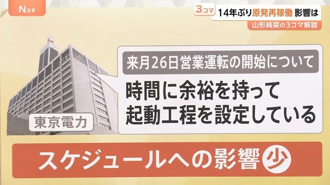 東京電力は「時間に余裕を持って起動工程を設定しているので、スケジュールへの影響は少ないのではないか」としています。
