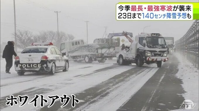 風に舞った雪で視界が遮られるホワイトアウトがいたるところで発生。青森市から蓬田村につながる国道ではトラックを含む7台の車両が絡む事故が起きました。