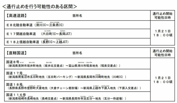 大雪による交通障害を未然に防ぐため、1月21日(水)午後6時頃(夕方以降)から、以下の路線で同時に通行止めが行われる可能性があります 。