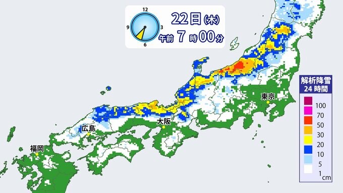 気象庁によりますと、北日本から西日本の日本海側を中心に、25日頃にかけて山沿いや山地だけではなく平地でも大雪となる所がある見込みです。北日本と西日本の日本海側では22日は、東日本の日本海側では23日にかけて、大雪による交通障害に警戒してください。