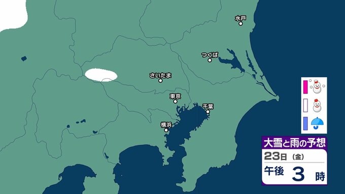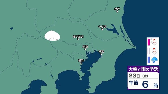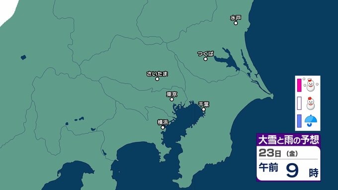 【東京の雪予報】首都圏24日(土)~25日(日)に広い範囲で雪雲が...きょう21日(水)は横浜・千葉で雪か 交通への影響に注意を / 東京・横浜・千葉・さいたま・つくば・水戸 21日~25日雪雨シミュレーショ【気象庁】 RSK山陽放送 2026年1月21日(水) 09:08 国内 天気 23日(金) 23日(金)のシミュレーションでは埼玉県と東京都の一部地域で雪雲がみられます。 ▶雪と雨のシミュレーション