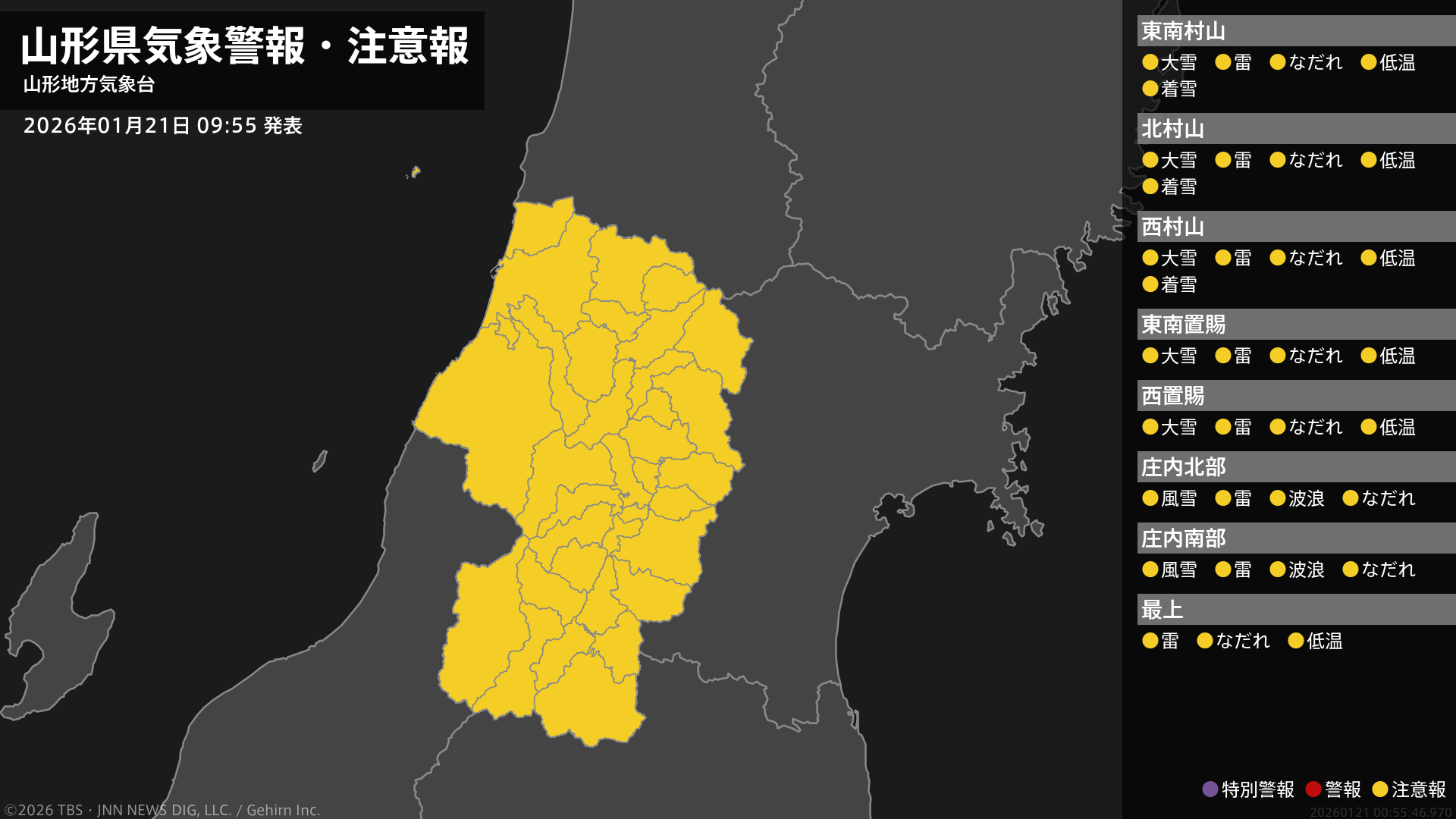 気象台は、午前9時55分に、なだれ注意報を鶴岡市、酒田市、庄内町、遊佐町に発表しました。