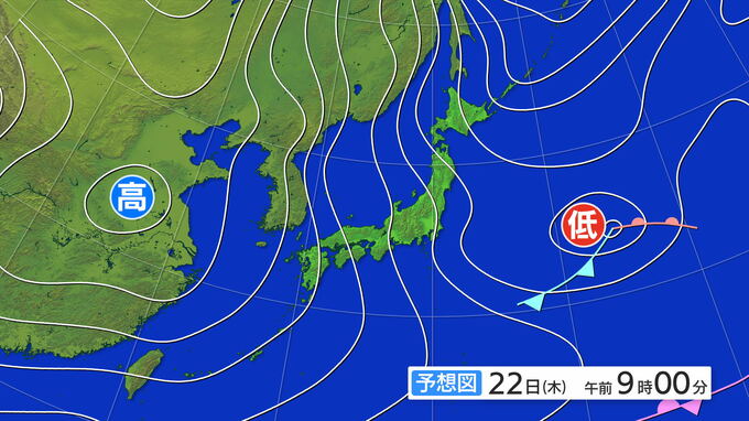 22日(木)午前9時の予想天気図でも、日本海は等圧線が縦にのびていて、北から北西よりの風が強まりそうです。