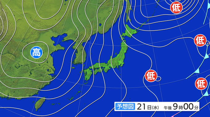 21日(水)も冬型の気圧配置は続き、