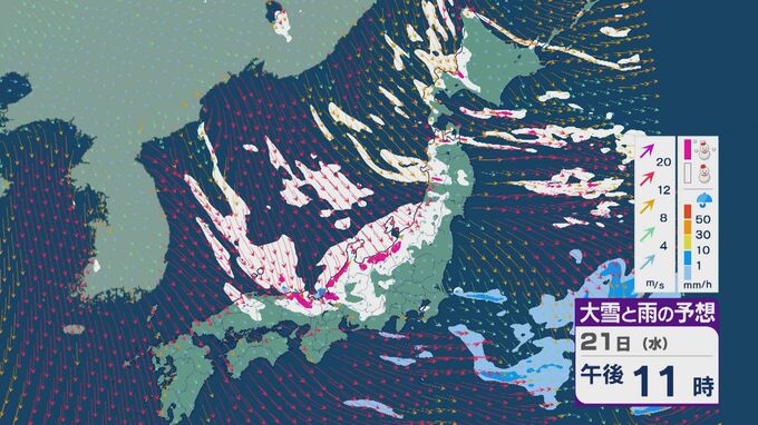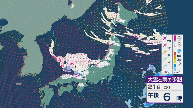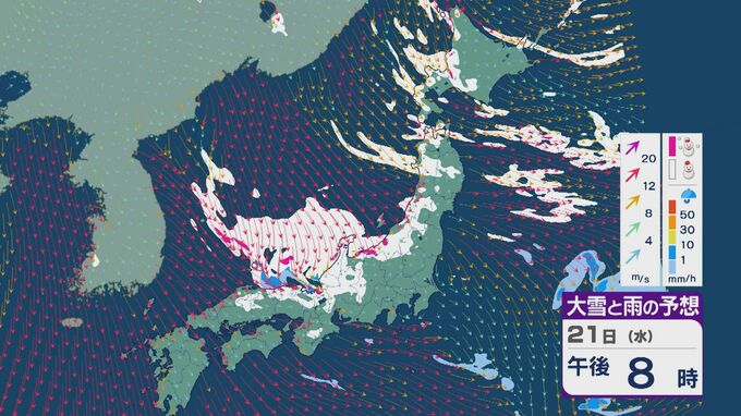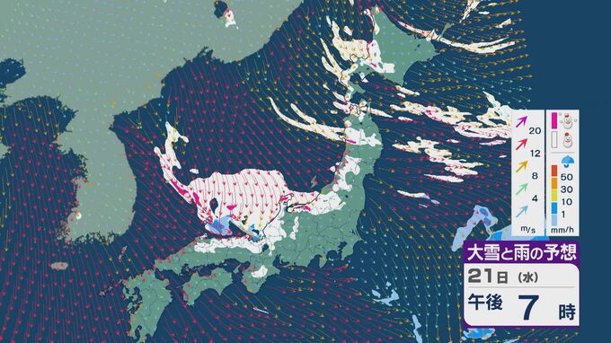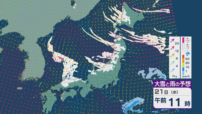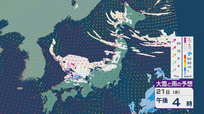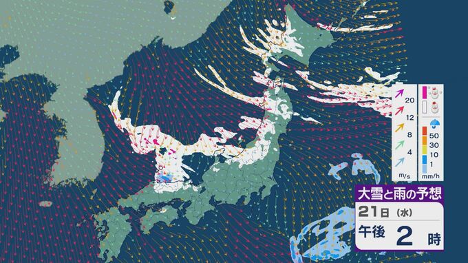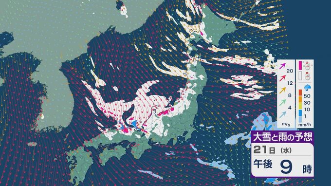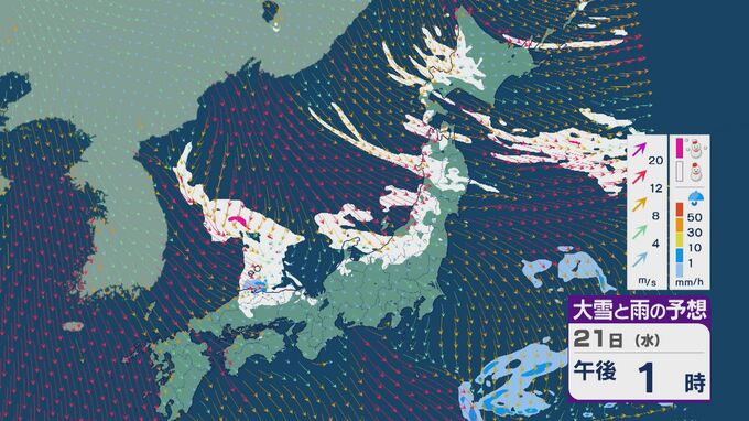 【大雪情報】21日(水)~22日(木)は「JPCZ」による発達した雪雲が山陰・近畿北部・北陸に流れ込み大雪に 24時間予想降雪量の最大は北陸で100センチ 近畿で70センチに 雪と風シミュレーション 3時間前