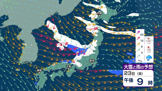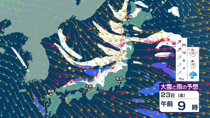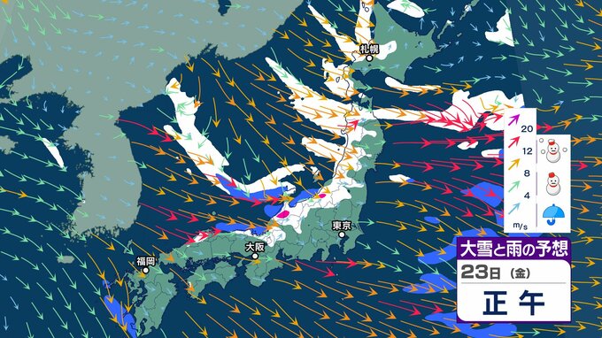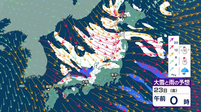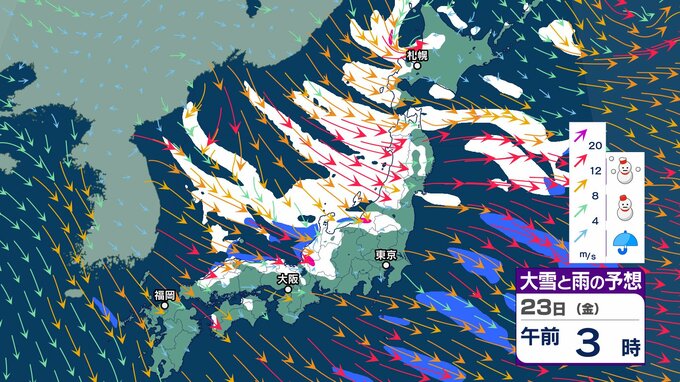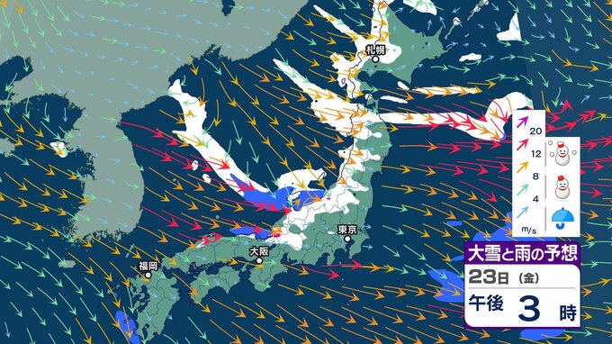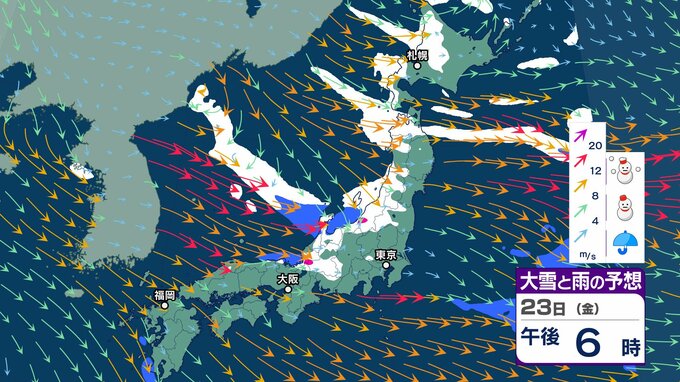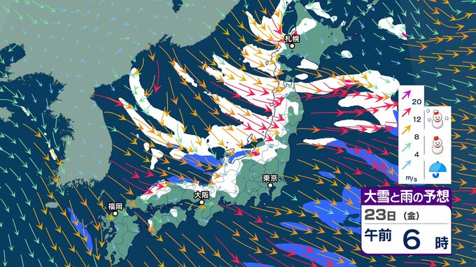 気象庁によりますと、22日6時から23日6時までに予想される24時間降雪量は多い所で、
