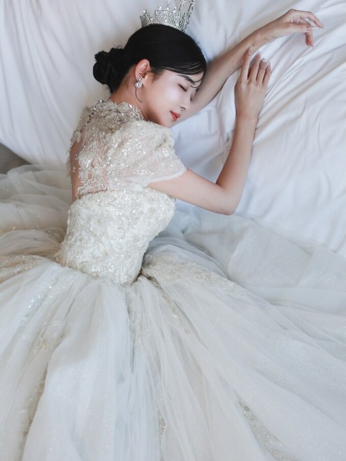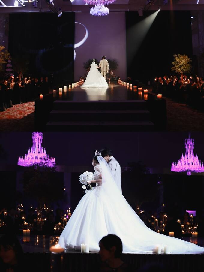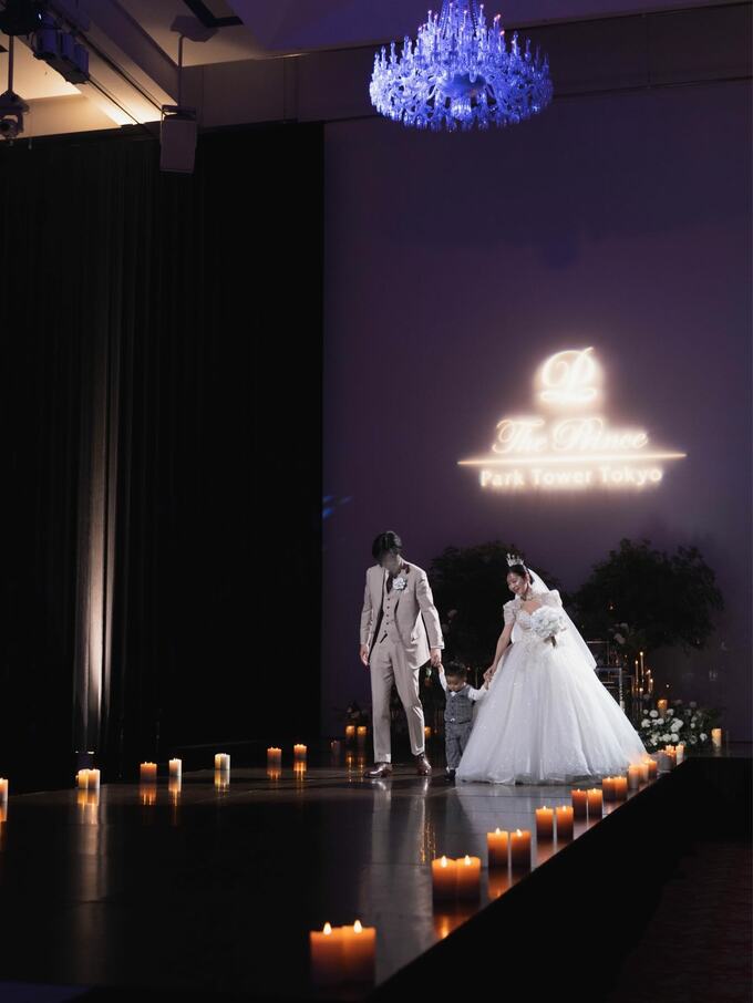 披露宴では、新郎とともにキャンドルが並ぶ中央の通路をゆっくりと歩む様子も写真に収められていました。