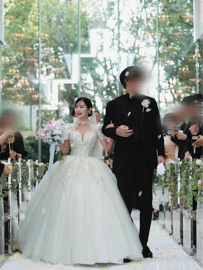 純白のウェディングドレスを身にまとった休井さんは、ティアラを戴き、長いベールとトレーンを引いた姿で式に臨みました。花道には白い絨毯と花びらが散りばめられ、休井さんは淡いピンクと白のブーケを手に、新郎の左腕に手を添えながら穏やかな笑顔で歩む姿が印象的です。