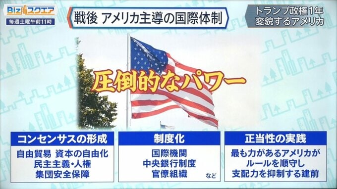 「アメリカの経済力・軍事力・技術力のもとで、自由貿易とか民主主義とか集団安全保障をやっていって、みんなでWin-Winの状況を作ってきていた。コンセンサスがあって、そのための制度として国際機関や中央銀行制度などができた。そして、最も力のあるアメリカがルールを順守し支配力を抑制する建前で、正当化を実践してきた」