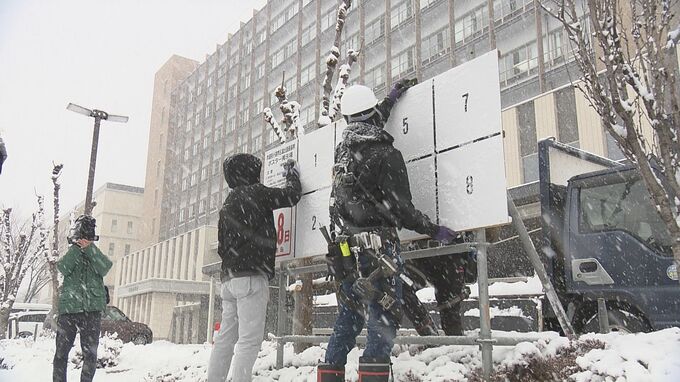 福島市役所では雪が降る中、午前9時前から福島1区の掲示板の設置作業が行われました。掲示板は、県内およそ6200か所に設置される予定でこのうち、福島市内では488か所に設けられます。