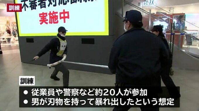 訓練には従業員や警察などおよそ20人が参加し、「男が刃物を持って暴れ出した」という想定で行われ、参加者がカートやさすまたで犯人役を取り押さえました。