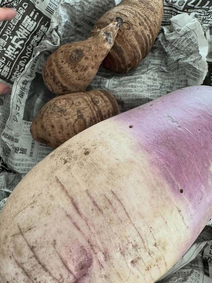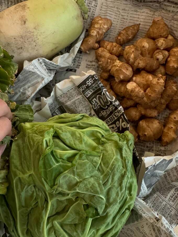 加藤さんは料理に使用した野菜の写真も共有。新聞紙の上に並べられたキャベツや、紫がかった大根と泥付きの里芋や菊芋の様子も確認できます。最後に「野菜を全て使い切ると気持ちがいいよね!」と加藤さんは述べています。