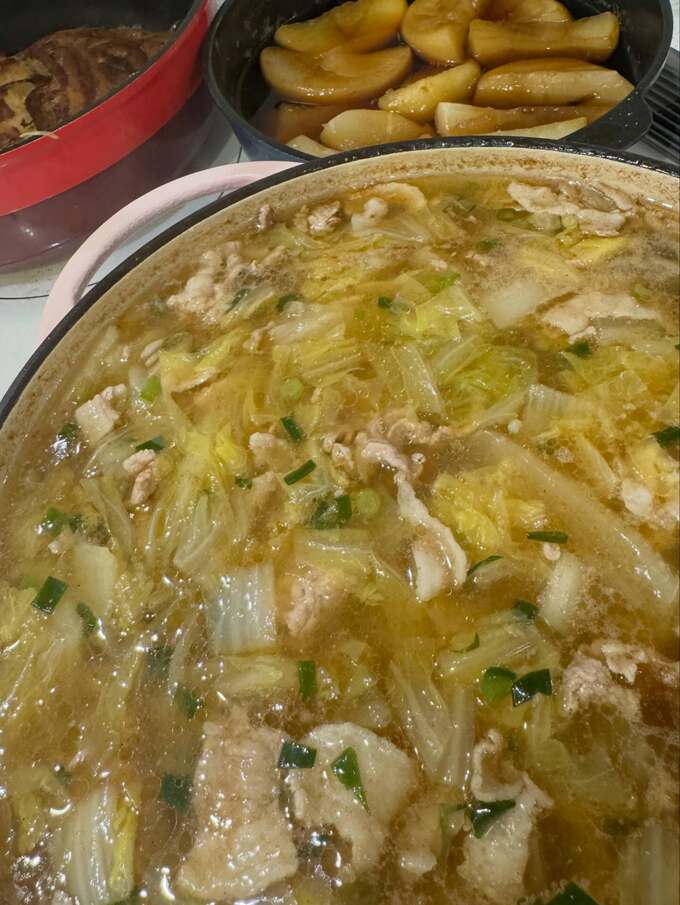 お好み焼きだけでなく、白菜と豚バラのスープも用意。「白菜と豚バラのスープや大根を煮たよ。トロミがついたスープは身体がポカポカになるよね!」と、冬の寒さに寄り添う献立を披露しました。