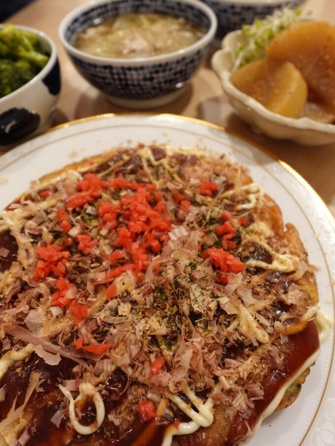 この日のメインは、たっぷりの野菜を使ったお好み焼き。「菊芋を千切りにし、キャベツ、ネギなど家にある野菜をたくさん入れたよ」と紹介されたお好み焼きには、ソースやマヨネーズ、紅しょうが、鰹節が食欲をそそるように盛り付けられています。