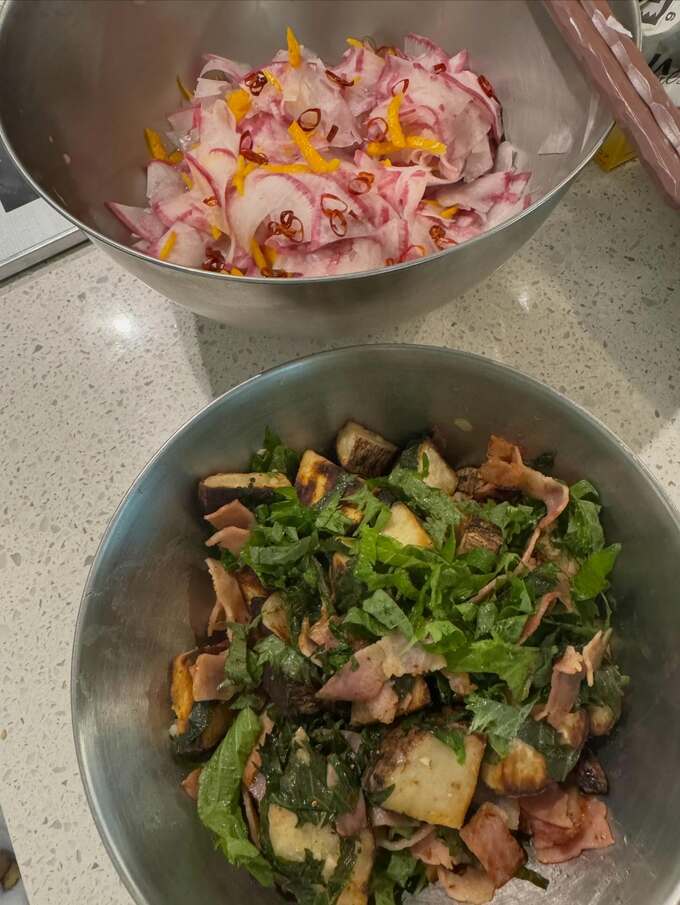 また、加藤さんは「余った大根で柚子はちみつ漬けにした」とも紹介しており、写真では、彩り豊かな紫大根と柚子皮が盛られたボウルが写っています。さらに「里芋を揚げ焼きにしてカリカリにしたベーコンとシソで和えたら美味」とあるように、シソと里芋、ベーコンが混ざった料理も用意されています。