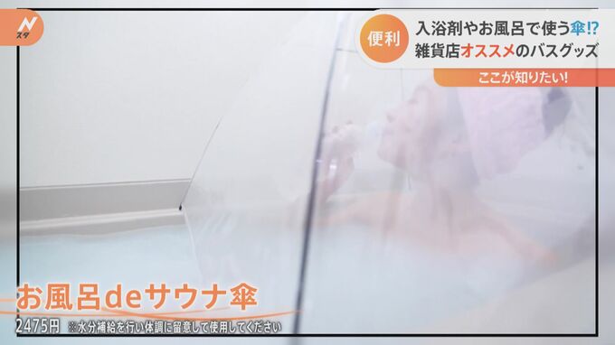 「お風呂deサウナ傘(2475円 ※水分補給を行い体調に留意して使用してください)」はひっくり返った傘かと思いきや、大間違い!浴槽のへりに設置すると、おうちで簡単にサウナ気分が味わえちゃうんです!