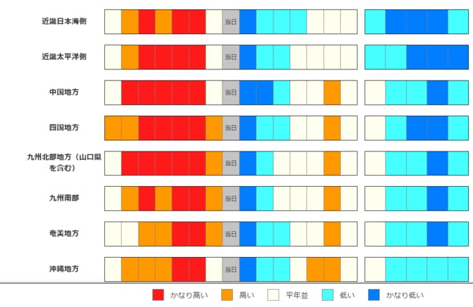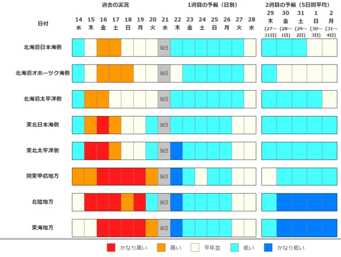 ・2週目の予報は毎日14時30分に発表します。その後ページの内容を更新するため、内容の確認は14時45分以降にお願いいたします。1週間先までの予報は随時更新しています。