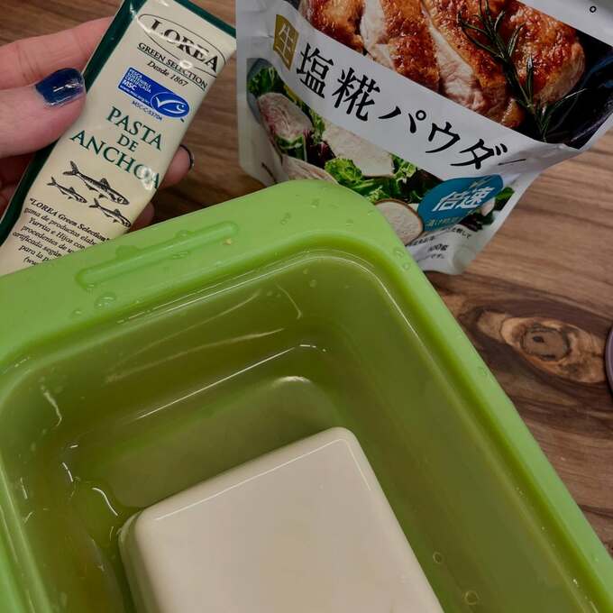 ドレッシングの材料は「絹豆腐半丁 チューブアンチョビ グリークヨーグルト 粉チーズ を混ぜます!」とのことで、「私は塩麹をヨーグルトに混ぜて水切りしたのを少し入れています。作り方は次回!」と補足しています。