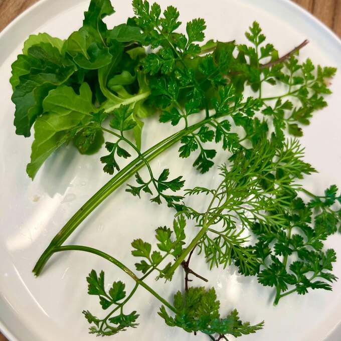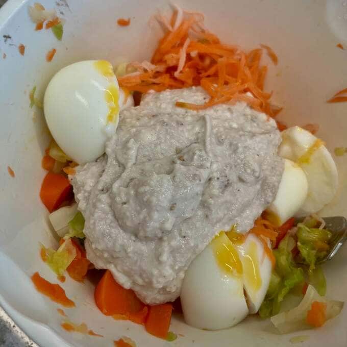 このドレッシングに合わせたサラダには、「ニンジン キャベツ もうギリギリのお庭ハーブ ゆで卵 千切りピクルスの大根人参 ルッコラ トマトなどなど」が入っているそうです。